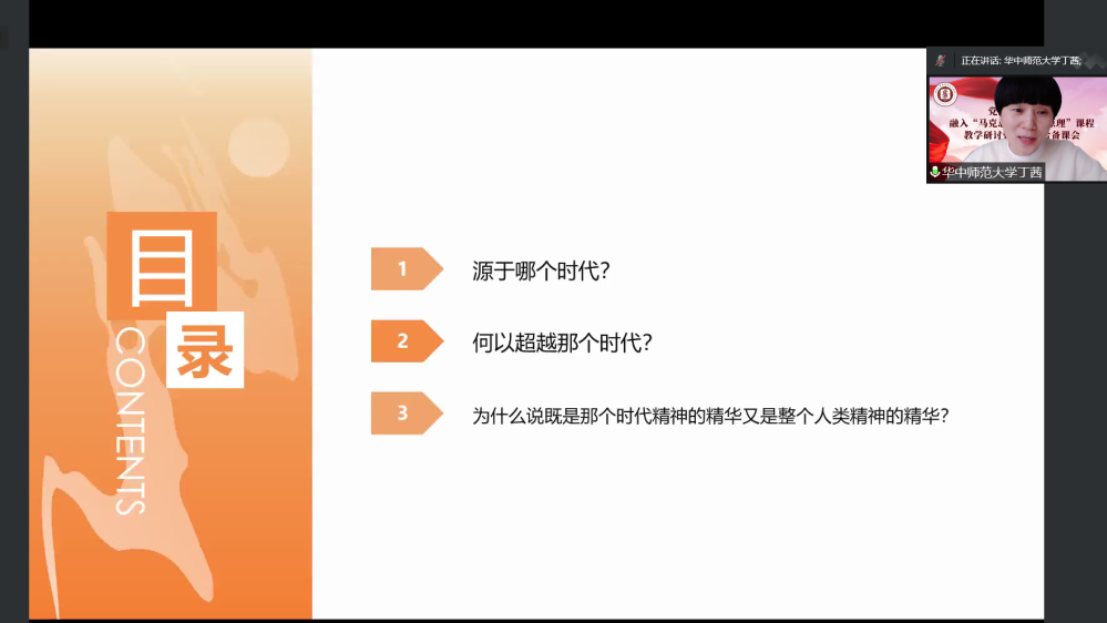 示范教学环节由教育部“全国高校思想政治理论课教学标兵”、华中师范大学伟德国际1946丁茜副教授展示。她以“走进马克思主义”为论题,从马克思主义源于哪个时代、它何以超越那个时代、为什么说马克思主义既是那个时代精神的精华又是整个人类精神的精华三个层面逐层分析,阐述了马克思主义的创立、发展和价值。