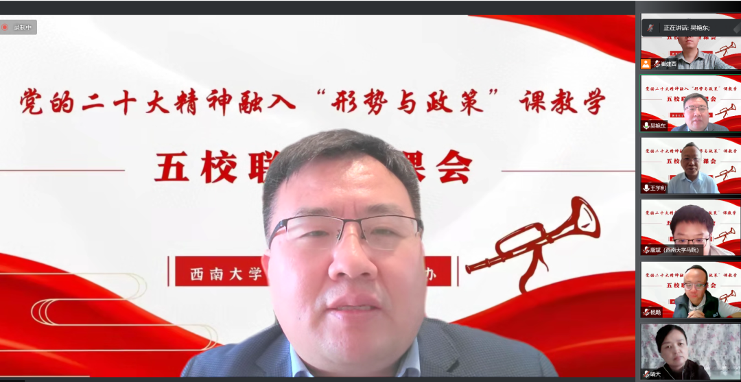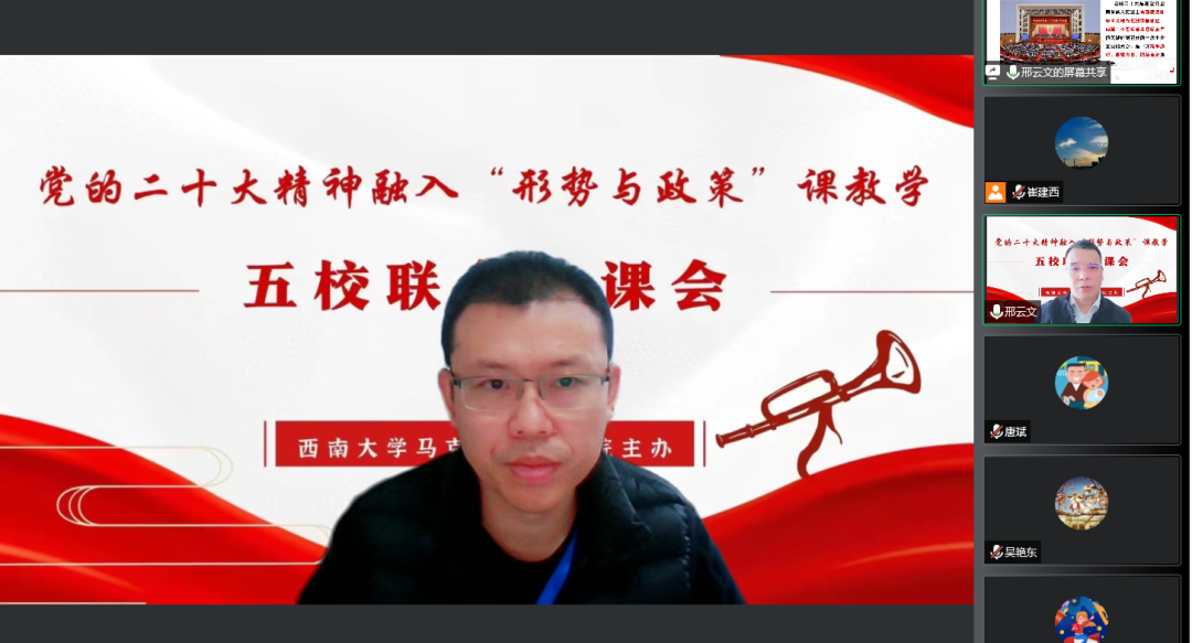 为深入学习党的二十大精神,将党的二十大精神及时、准确融入“形势与政策”课教学,11月7日上午,由伟德国际1946主办,全国高校思想政治理论课“手拉手”集体备课中心(伟德BV1946官网-重庆市)、重庆市大中小学思政课一体化建设协同创新中心承办,西南政法大学伟德国际1946、重庆医科大学伟德国际1946、重庆城市管理职业公司伟德国际1946、新疆农业职业技术公司伟德国际1946协办的党的二十大精神融入“形势与政策”课教学联合备课会顺利进行。来自重庆、新疆等地的近150位思政课教师相聚云端,共襄盛会。此次联合备课会共分为专家导学、教学观摩、集体备课三个阶段,会议分别由伟德BV1946官网公司党委常务副书记廖晓衡、副经理吴艳东主持。