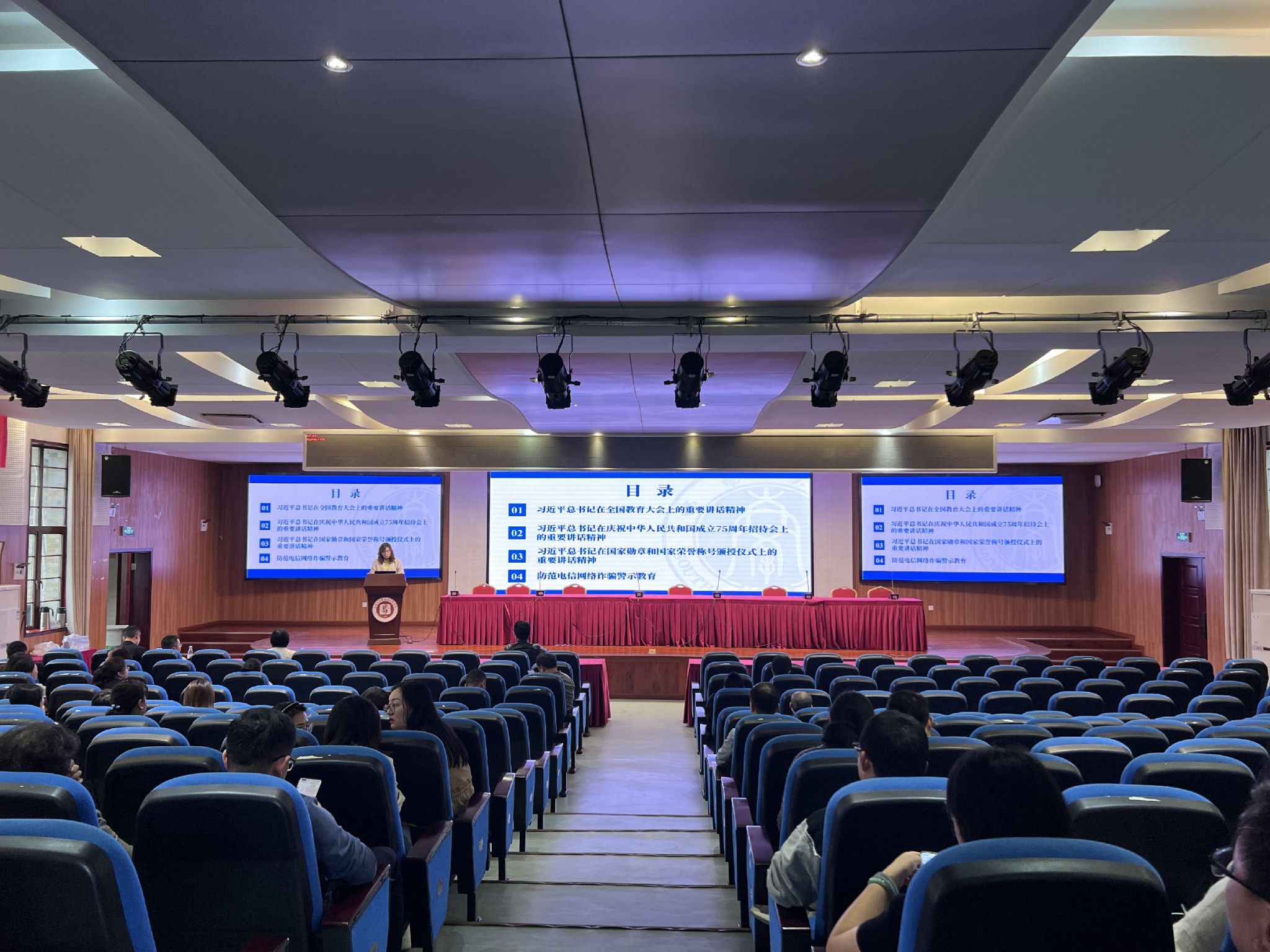 会上,邓春芝带领全体教职工集中学习了四个部分的主要内容:第一部分,学习了习近平总书记在全国教育大会上的重要讲话精神,指出会上强调了教育对于建设现代化强国的重要性,并突出教育强国的六大特质以及需要处理的五大关系;第二部分,学习了习近平总书记在庆祝中华人民共和国成立75周年招待会上的重要讲话精神,重点学习推进中国式现代化需要坚持的四点要求;第三部分,学习了习近平总书记在国家勋章和国家荣誉称号颁授仪式上的重要讲话精神,借表彰国家勋章和国家荣誉者之际,强调了全党全国各族人民要以英雄模范为榜样,团结奋进、砥砺前行,汇聚起共襄强国盛举的磅礴力量;第四部分,进行了防范电信网络诈骗警示教育,强调全体教职工加强电信安全意识,谨防电信诈骗。