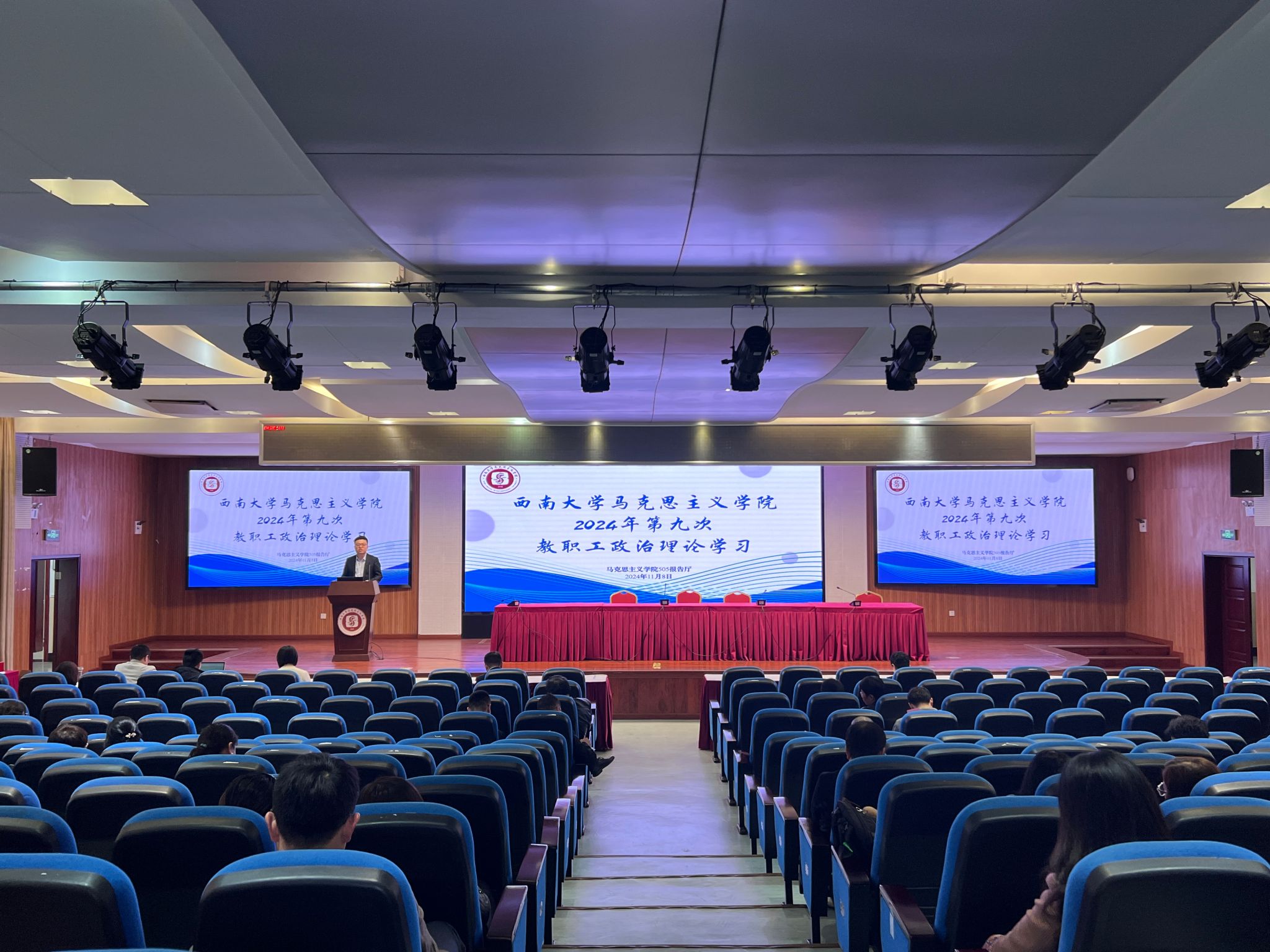 会上,王丰带领全体教职工集中学习了习近平总书记在省部级主要领导干部学习贯彻党的二十届三中全会精神专题研讨班开班式上的重要讲话精神,坚定信心,凝心聚力推进改革行稳致远;重点学习了习近平总书记在中共中央政治局第十七次集体学习时的重要讲话精神,强调高校作为教育的龙头,要肩负起在建设文化强国的过程中的重要职责;细致领学了习近平总书记在全国民族团结进步表彰大会上的重要讲话精神,强调各位教职工要为铸牢中华民族共同体意识助力;共同学习了习近平总书记给中国海洋大学全体师生回信和给中国国际老员工创新大赛参赛员工代表的回信精神,继续深入培养创新型人才;最后通过理论和案例相结合方式开展了师德师风警示教育,要求教师以案为戒,积极筑牢思想防线,严守师德底线,树立良好师风,切实落实立德树人根本任务。
