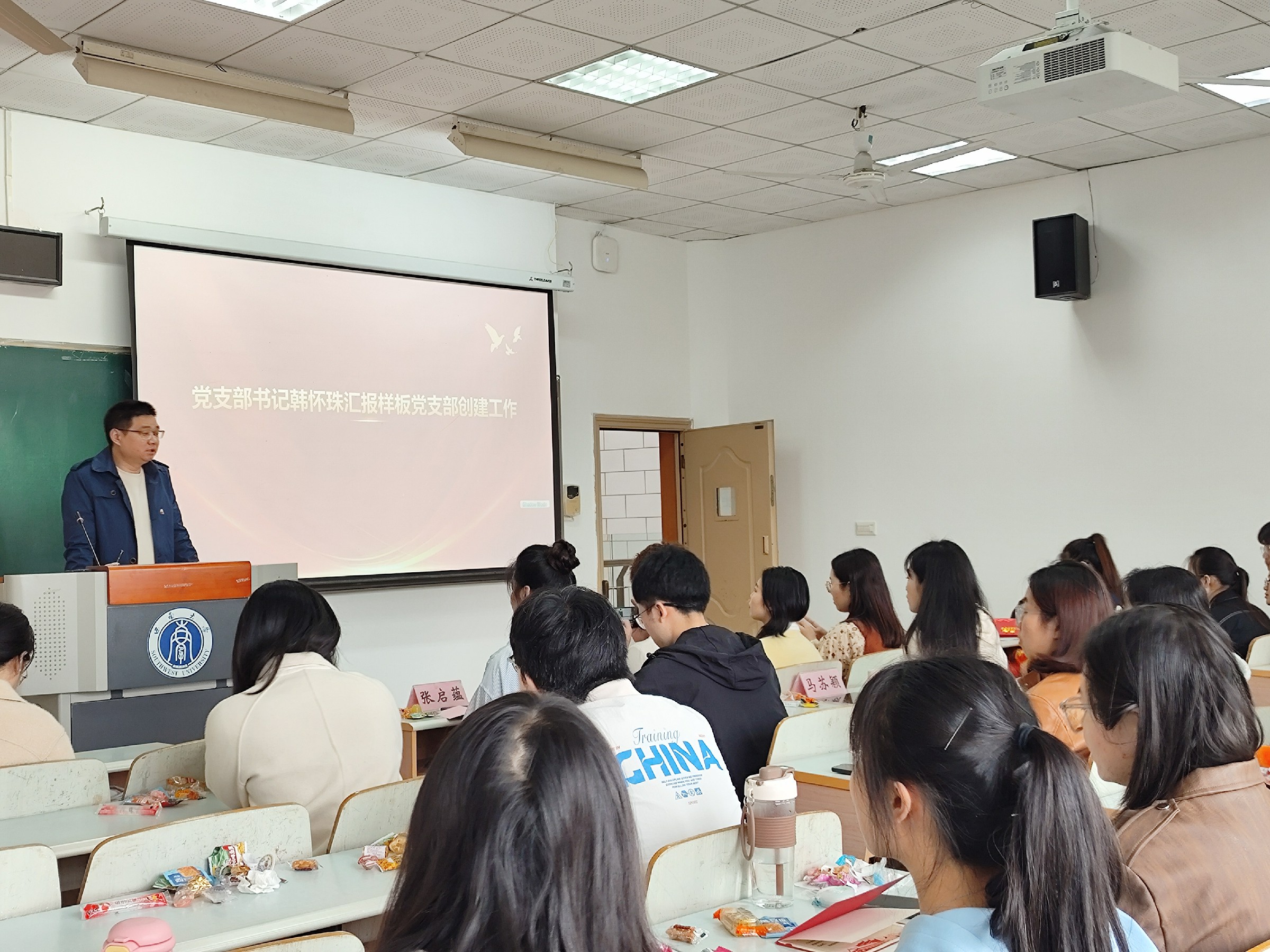 最后党支部书记韩怀珠汇报样板党支部创建工作。通过回顾创建历程、党建原理阐释、实践经验交流,他鼓舞支部同志以身作则共建和谐团结的党支部,拧成一股绳,尽心尽力尽责任做好研究生支部党建工作。