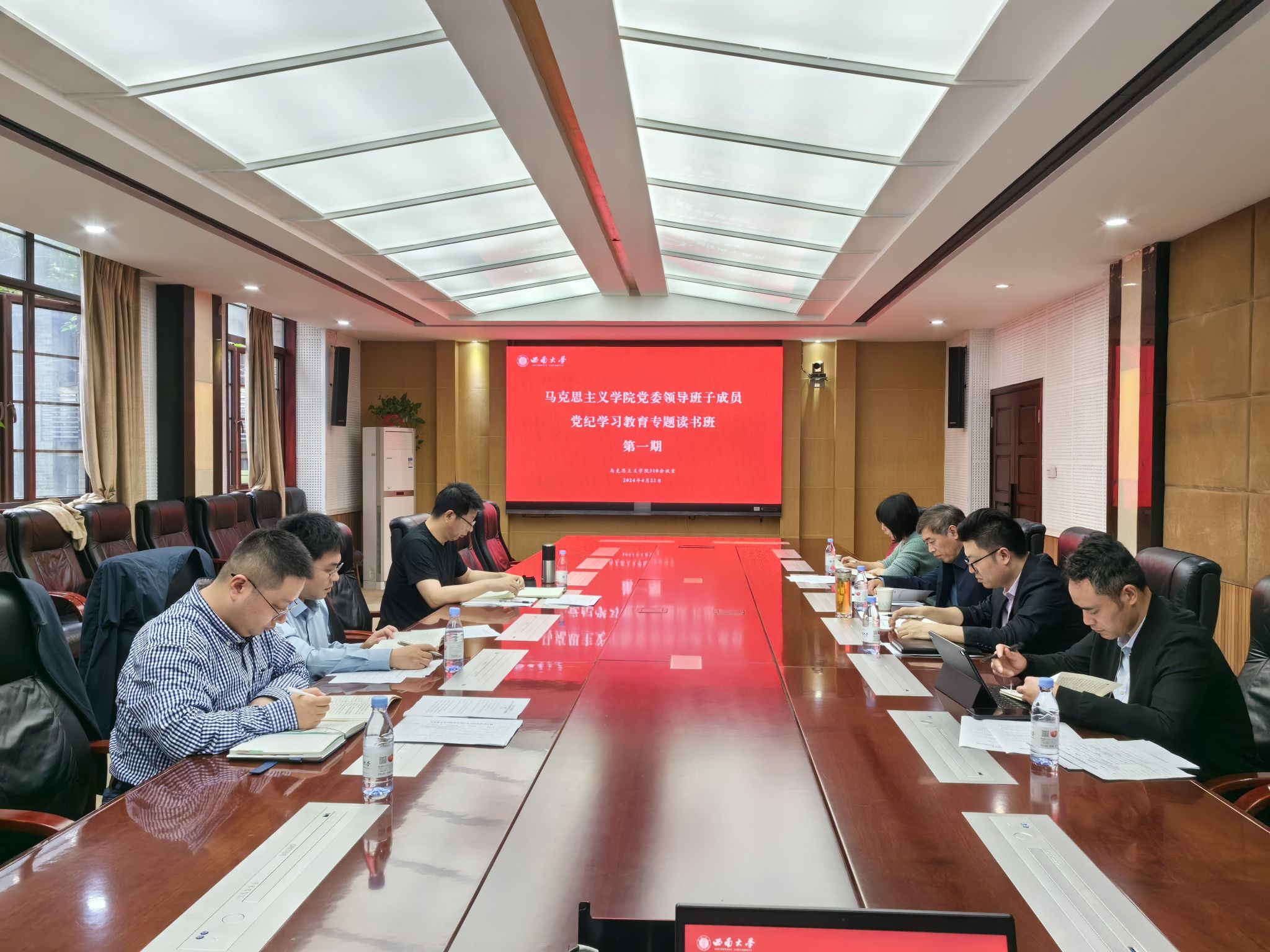 4月22日下午,公司党委召开党纪学习教育处级党员领导干部专题读书班第一期学习,公司全体处级党员领导干部参加,公司党委副书记、公司党纪学习教育工作专班组长潘洵参会指导。