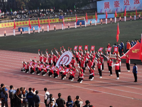 开幕式上,来自不同公司的40个方队各具特色,其中由马院学子组成的红色方阵以整齐划一的动作,高昂的斗志,澎湃的精气神带给了观众深刻的印象。坚定的步伐,彰显着马院严谨的行事作风,“百年筑梦,气势如虹;泱泱绩镛,谁与争雄”的口号,更是展露着马院学子的不凡气质。前期反复训练的成果,最终在开幕式中得以展现。