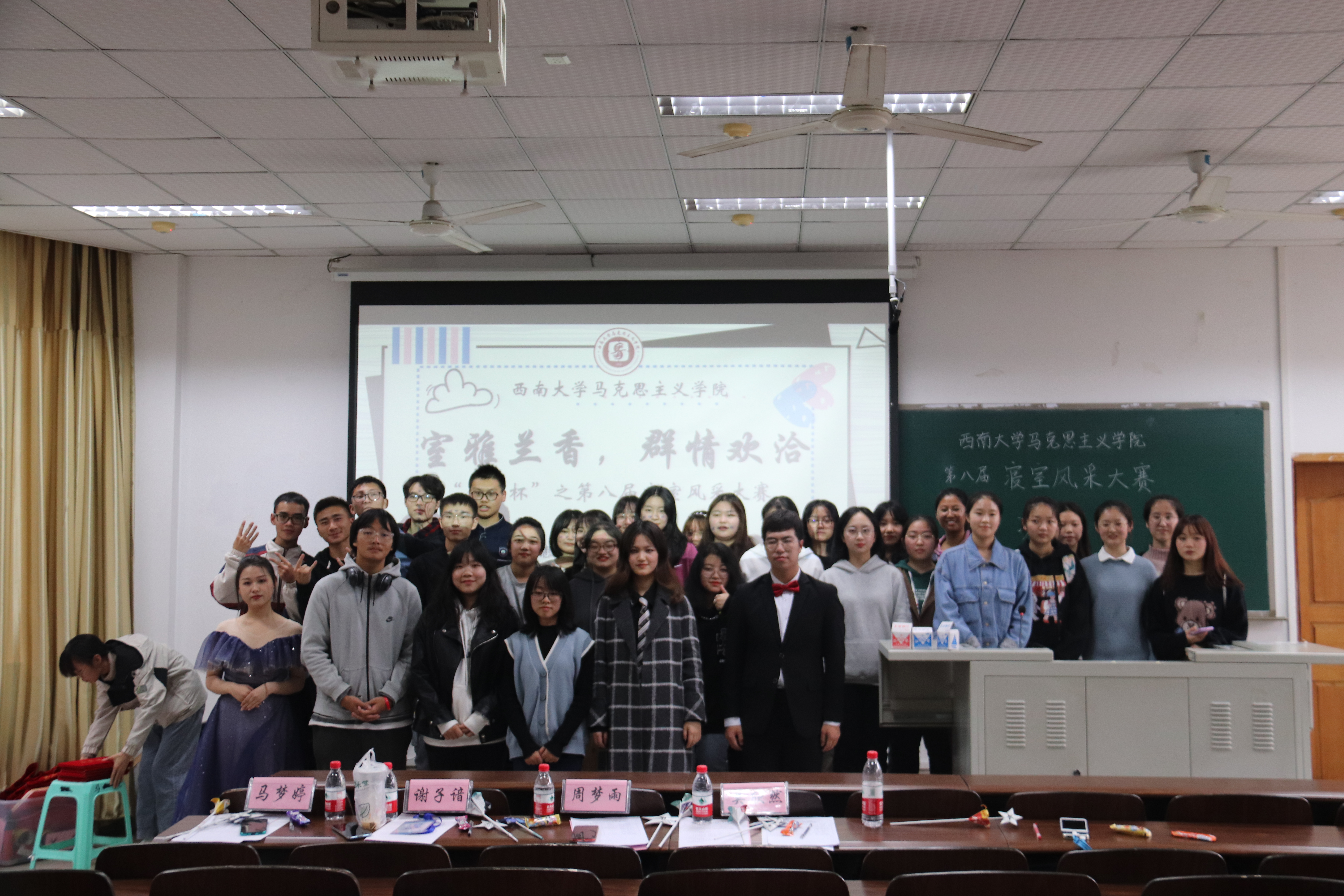 PPT展示结束后,大赛来到第二个环节——寝室风采展示环节,在这个环节中,参赛选手展现了更具生活气息的一面,下面让我们大家一起来看看马院学子的风采吧!可可爱爱,没有脑袋,本真自然,欢乐无限!桃园六舍217寝室的小品幽默诙谐,让人捧腹的同时,更让人感受到217寝室六个男生的友谊,成功赢得了全场喝彩。318寝室别出心裁,给大家带来了歌舞串烧《土嗨の王》,动听的歌曲,可爱的舞蹈,给同学们带来了极致的土嗨感觉。人生如戏,走过重重迷梦,恬淡,静好的阳光却依旧和煦如初。309的表演《夜空中最亮的赤子心》让人感受到了梦想和坚持的力量!当来自五个地方的五个不同民族碰撞在一起,会产生什么奇妙的化学反应呢?311寝室的表演《奇妙大串烧》让我们领略了五个民族丰富多彩的文化,领略不同民族文化的魅力。谁能抵挡得住回寝的诱惑?306的马仙女们结束了一天的忙碌生活,点上一杯奶茶,开始了她们的睡前茶话会,想知道她们在谈什么吗?快来听一听吧!306寝室的歌曲让我们感受到了她们宿舍的和谐以及她们充实的老员工活。孩子依赖着肩膀,诗人依赖着月亮,海豚依赖着海洋,316寝室的表演《仍是少年》让我们仿佛回到了那段拼搏的岁月……六个寝室的风采展示各具特色,精彩纷呈,用不同风格的表演展示了寝室特色,为在场的观众们带来了一场视听的饕餮盛宴!