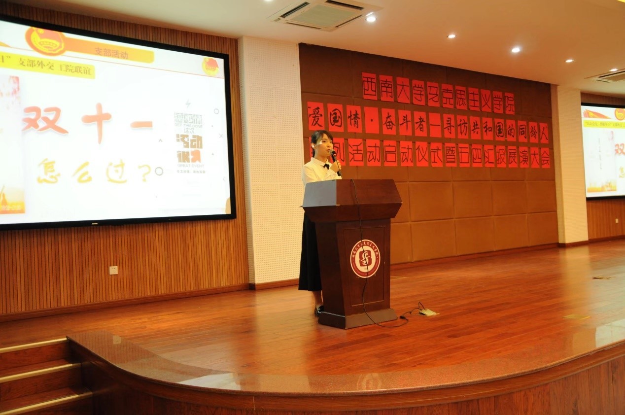 紧接着,活动进入精彩的支部汇报展演环节。本次汇报展演大会包括支部汇报展示和答辩两个环节,制作精良的ppt、幽默又富含深意的视频、形式新颖多样的汇报,活动氛围在严谨中又不失活泼。首先上台的是2017级思政一支部,两位汇报人以对话的方式介绍支部的建设成果,风趣幽默的视频也赢得了阵阵掌声;2017级思政师范一支部则以“追光者”展览的新颖汇报方式带领大家领略其支部建设;2017级思政师范三支部创意地使用了新闻联播的元素,以第三方记者角色的视角展示了支部风采;2018级思政师范三支部汇报铿锵有力,其支部精彩纷呈的团日活动如寻访张自忠将军、学习五四精神等,都赢得了观众的赞赏。