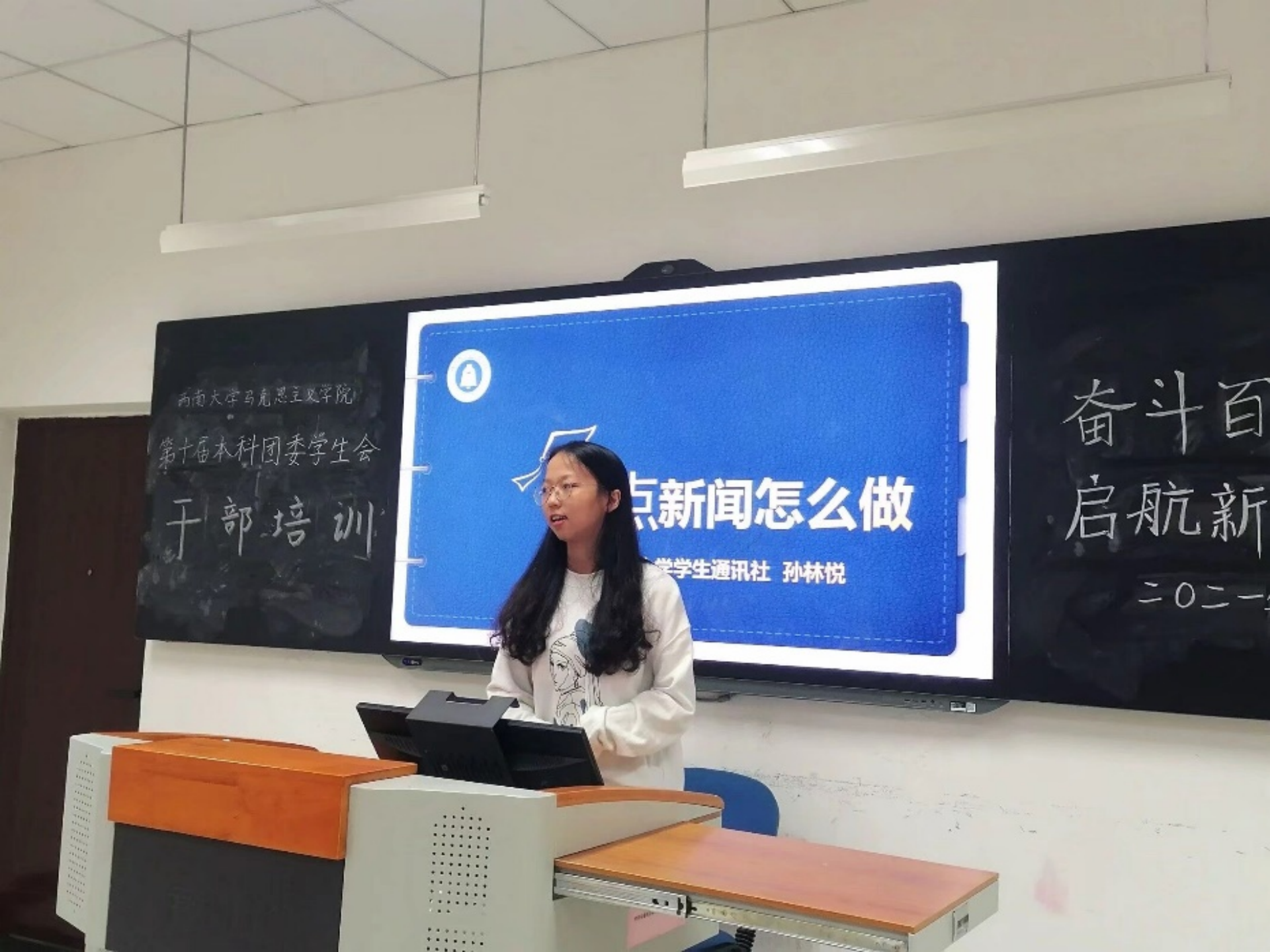 首先,由孙林悦同学为大家进行了“亮点新闻怎么做”的新闻稿编写培训,针对新闻稿编写中重要的选题、标题和导语问题进行了讲解。孙林悦同学指出,选题选得好,新闻就成功了一半,并阐明了标题吸引读者的基本原理和必由之路,针对导语的编写,也提出了“概括内容,展示两点”的重要方法,最后强调了练习的重要性,并展示了《荣国府公子昨晚被骗成亲》这一优秀范例,使得培训气氛活泼欢快。
