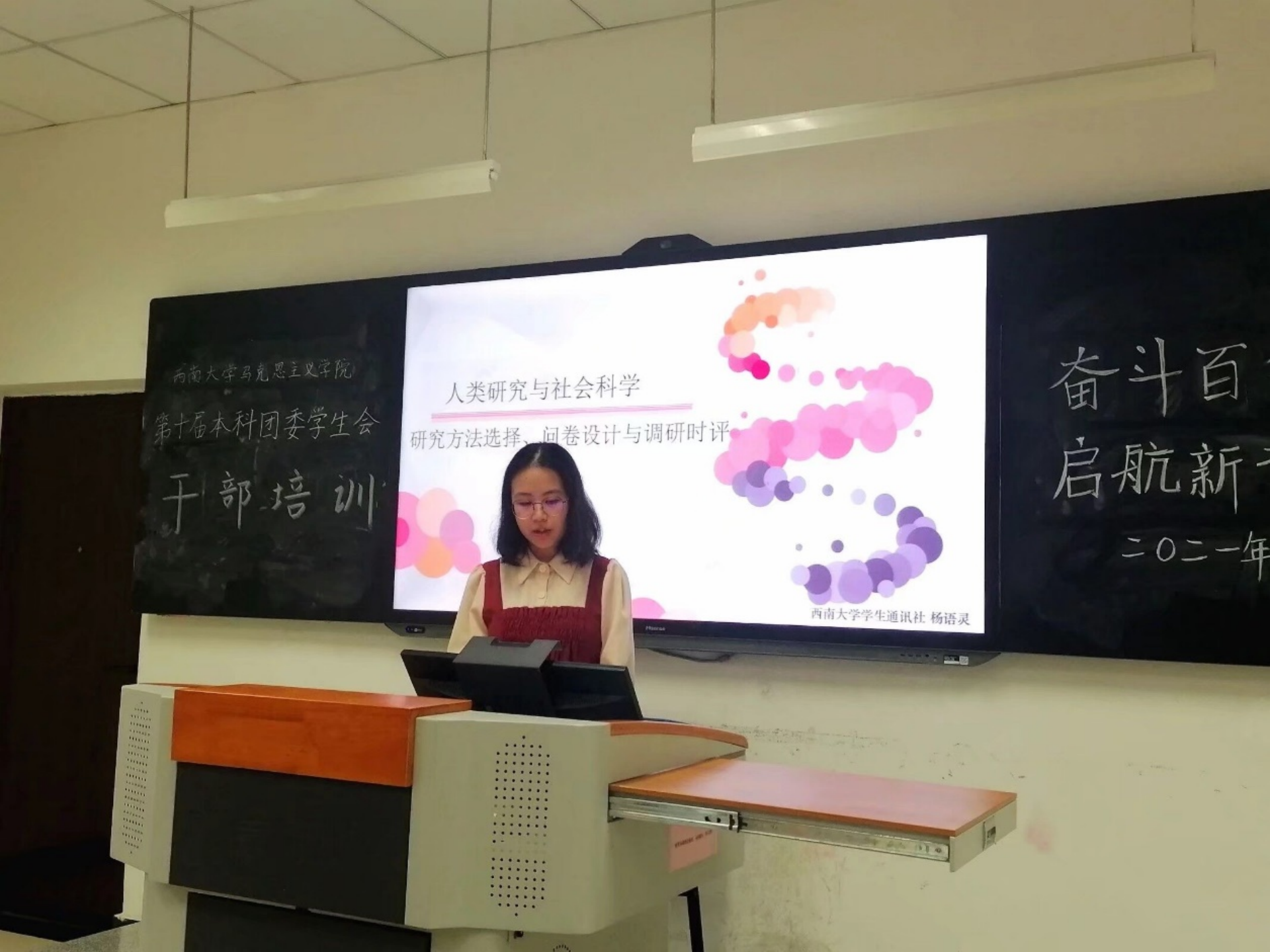 后由杨语灵同学进行“人类研究与社会科学”调研培训,杨语灵同学通过深入浅出的讲解和严谨求实的态度,分别从“何为研究”“理论与范式”“研究的构建与方法的选择”等方面进行讲解,最后进行了“调研时评”的专项讲解,利用之前的理论,切合时代痛点,以时下最令人关注的“儿童网民”现象,结合多方资料,做出了有理有据、意义深远的研究,帮助大家进一步熟悉了理论知识的运用,使大家获益匪浅。
