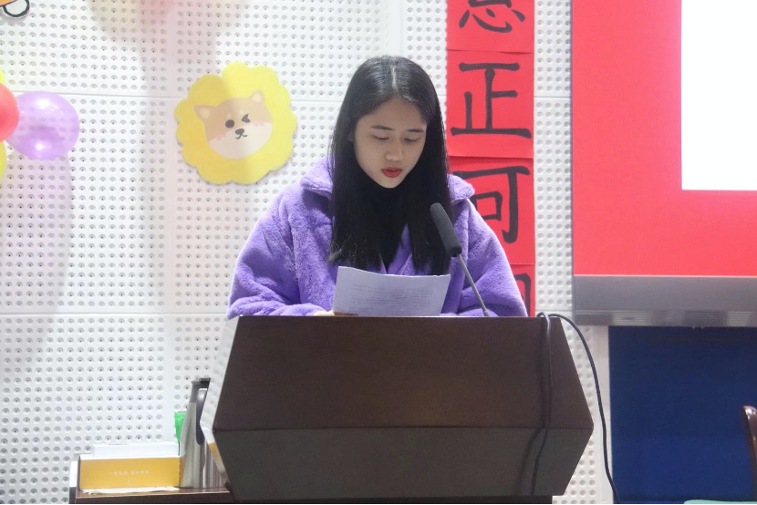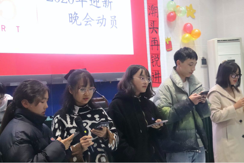 最后,由文体部主持2022年迎新晚会动员大会。文体部全体工作人员上台献唱一首《告白气球》点燃全场热情。一首曲毕,文体部负责人代表傅雅上台发言,宣读 2022年迎新晚会前期注意事项,提出了迎新晚会工作任务的困难性,鼓舞全体工作人员提高工作积极性,并对迎新晚会具体人员分工名单进行了宣读。之后,文体部工作人员依次上台宣读伟德国际19462022年迎新晚会话筒组、催台组、道具组、音乐组注意事项。
