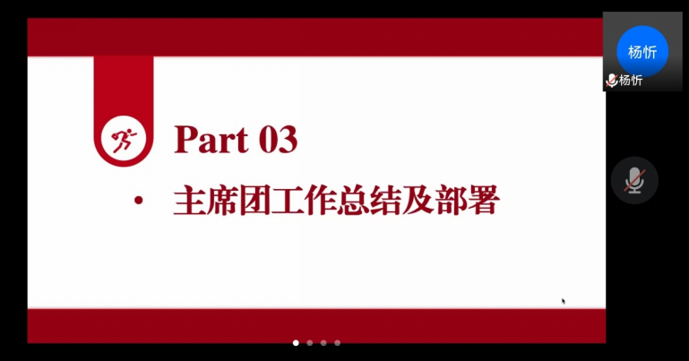 随后,伟德国际1946第十届本科团委员工会主席团代表团委副书记杨忻同学进行了工作总结及工作部署。她重点强调了在严峻的疫情防控局势之下,员工会要坚持以线上线下联动的形式更好地开展工作;优化组织结构,加强员工会工作人员的思想建设和作风建设,坚持从同学中来到同学中去的工作方法;恪尽职守,站好最后一班岗,成为有理想有抱负有担当的人。