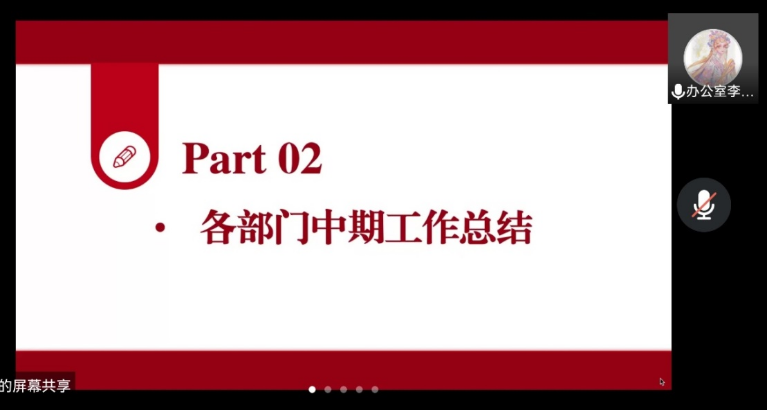 而后,各部门负责人按八大部门的顺序依次进行中期工作总结。负责人们进行了半学期以来的工作回顾,做出工作反思,提出未来工作改进的方法,并对公司本科团委员工会的未来发展做出展望,加强部门家文化建设,凝心聚力更进一步,为员工会献出自己的一份力量。