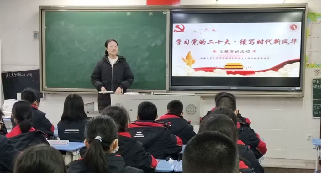 2月12日,宣讲团成员高菲同学前往重庆市松树桥中学,以“民生”主题向初一员工开展宣讲。高菲同学通过图片、语言等方式生动描述了十年来我们党开展的民生工程及共产党员为民服务的辉煌历程,使初一的员工们深刻感悟到我们党始终将让人民生活幸福作为“国之大者”,今天的幸福生活离不开党的领导。