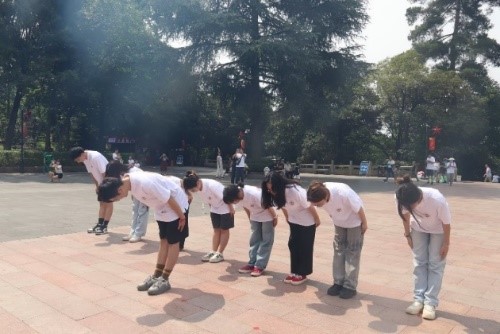 追思革命英魂,赓续红色力量。当日上午,实践团成员进入园内,在攀爬358个台阶后,来到红军烈士纪念碑前方,碑的正面是1984年11月2日由邓小平题写的“红军烈士永垂不朽”八个大字。实践团全体成员面向红军烈士纪念碑,肃然鞠躬,向长眠于此的红军英烈表达崇高敬意。随后,成员缓步绕行至纪念碑东侧的“红军英烈墙”,以及北面的邓萍烈士墓,学习了红军艰苦卓绝的革命奋斗历史。
