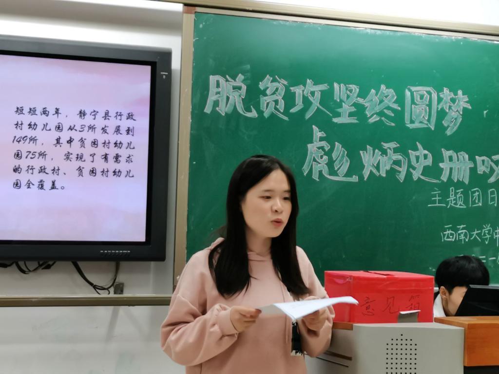 贫困是人类社会的顽疾,反贫困始终是古今中外治国安邦的一件大事。为深入了解脱贫攻坚的卓越成就,使团员加深对中华民族伟大复兴中国梦的理解,切实感悟党的初心使命,大力弘扬脱贫攻坚精神,伟德BV1946官网老员工中国特色社会主义理论体系宣讲团团支部(以下简称“员工宣讲团”)于3月23日22:10在伟德国际1946研究生教室一开展了以“脱贫攻坚终圆梦,彪炳史册叹人间”为主题的团日活动。