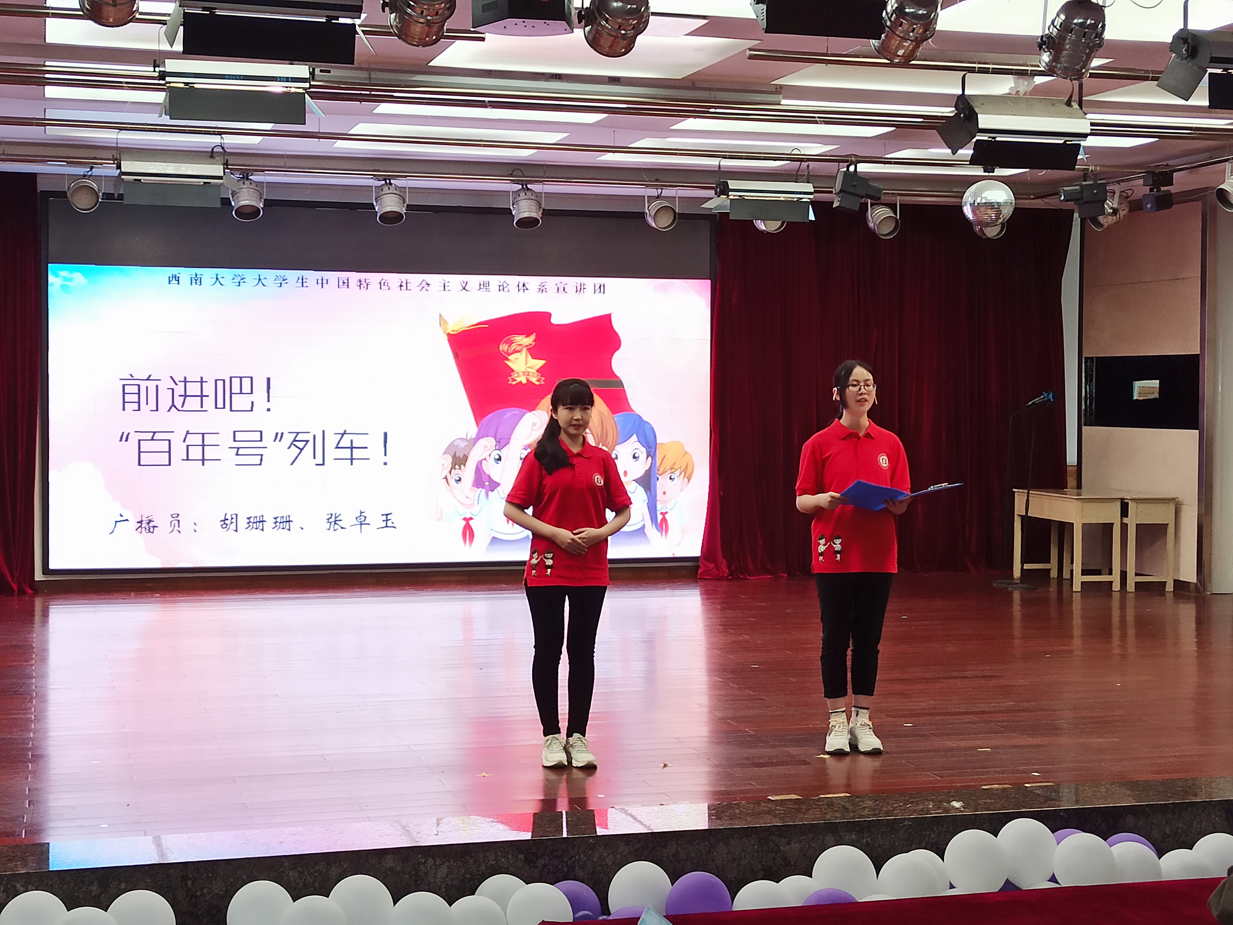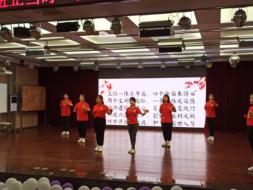 “南湖船,井冈山,党旗高举救河山。腊子口,娄山关,险阻难困英雄汉。”活动从快板声声中开始,小宣人手握快板、嘴吐唱词,通过活泼生动的快板舞表演,将党的百年历程展现出来,号召同学们爱党爱国、努力奋斗。这种创新的宣讲让观众们耳目一新——台上,宣讲员快板打得响亮,吐字清晰;台下,教师员工听得陶醉,连连叫好。从南湖建党出发,到抗日战争、解放战争、新中国建设、改革开放、新时代建设,这一段快板说下来,不仅新颖的宣讲形式深深地吸引了同学们,更使百年党史内容真正地走入了同学们的心中。