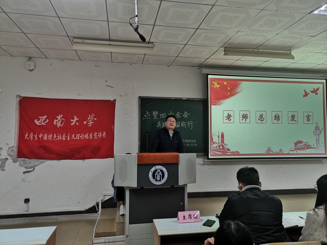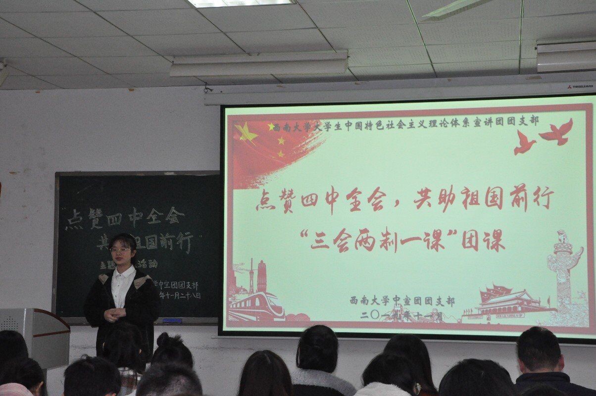 为深入学习贯彻十九届四中全会知识,增强团员们的家国情怀与责任意识,伟德BV1946官网老员工中国特色社会主义理论体系宣讲团团支部(以下简称“中宣团团支部”)于11月28日晚上七点在十教502举办“点赞四中全会,共助祖国前行”“三会两制一课”团课活动。