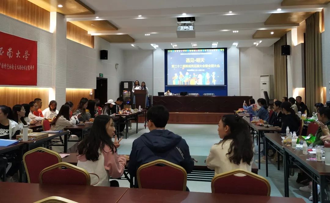 “湖南,重庆,山东,四川,新疆……”,“张家界,大足石刻,海鲜……”办公室,学研部,团学活动部,青马微声运营中心,宣讲部以及培训部六个部门的萌新们依次上台,或羞涩,或腼腆,或调皮,或热情……不同风格的自我介绍都用昂扬向上的姿态展现着新一代小宣人的青春活力。这次大会的另一部分主角们,也就是宣讲团的师兄师姐们用他们的方式表达了对萌新们的欢迎。主席团师兄师姐也都上台为亲爱的师弟师妹们寄语,侯瑜师姐“感谢,祝贺,期望”真挚的话语,高家毫师兄“很乖,很喜欢”直白而走心的告白……让新成员们感受到了员工宣讲团的温暖,和谐与团结。