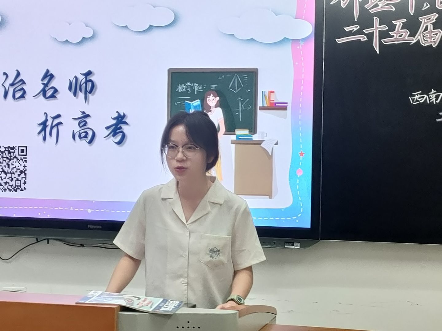 “不知过了多久,当你再睁开眼时,发现四周一切都变了,这里是你的高中教室?你穿越了……”随着轻缓动听的旁白声响起,全体团员“穿越”到了高考前100天。团员李思雨扮演伟德BV1946官网附属中学的政治名师,带领大家解读2022年时事政治热点,分析2022政府工作报告中蕴含的政治和经济知识。
