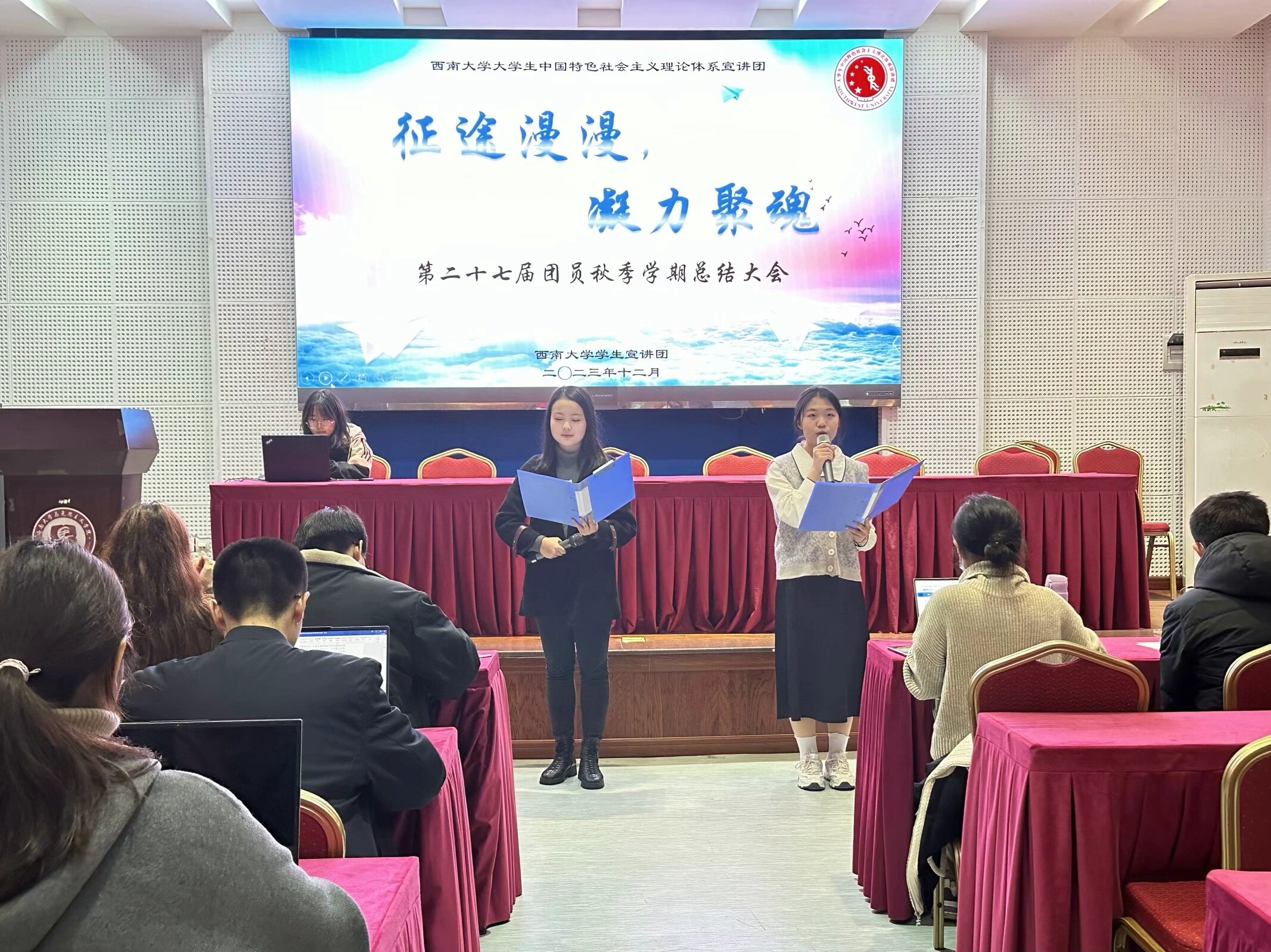 2023年12月9日晚,伟德BV1946官网老员工中国特色社会主义理论体系宣讲团(以下简称“员工宣讲团”)在伟德国际1946501报告厅举行了“征途漫漫·凝力聚魂”第二十七届团员秋季学期工作总结大会。本次活动总结了员工宣讲团过去一学期的工作成果,并对下一阶段的工作进行了总体规划,同时也加强了各部门间的交流与合作,促进了员工宣讲团的“家文化”建设。