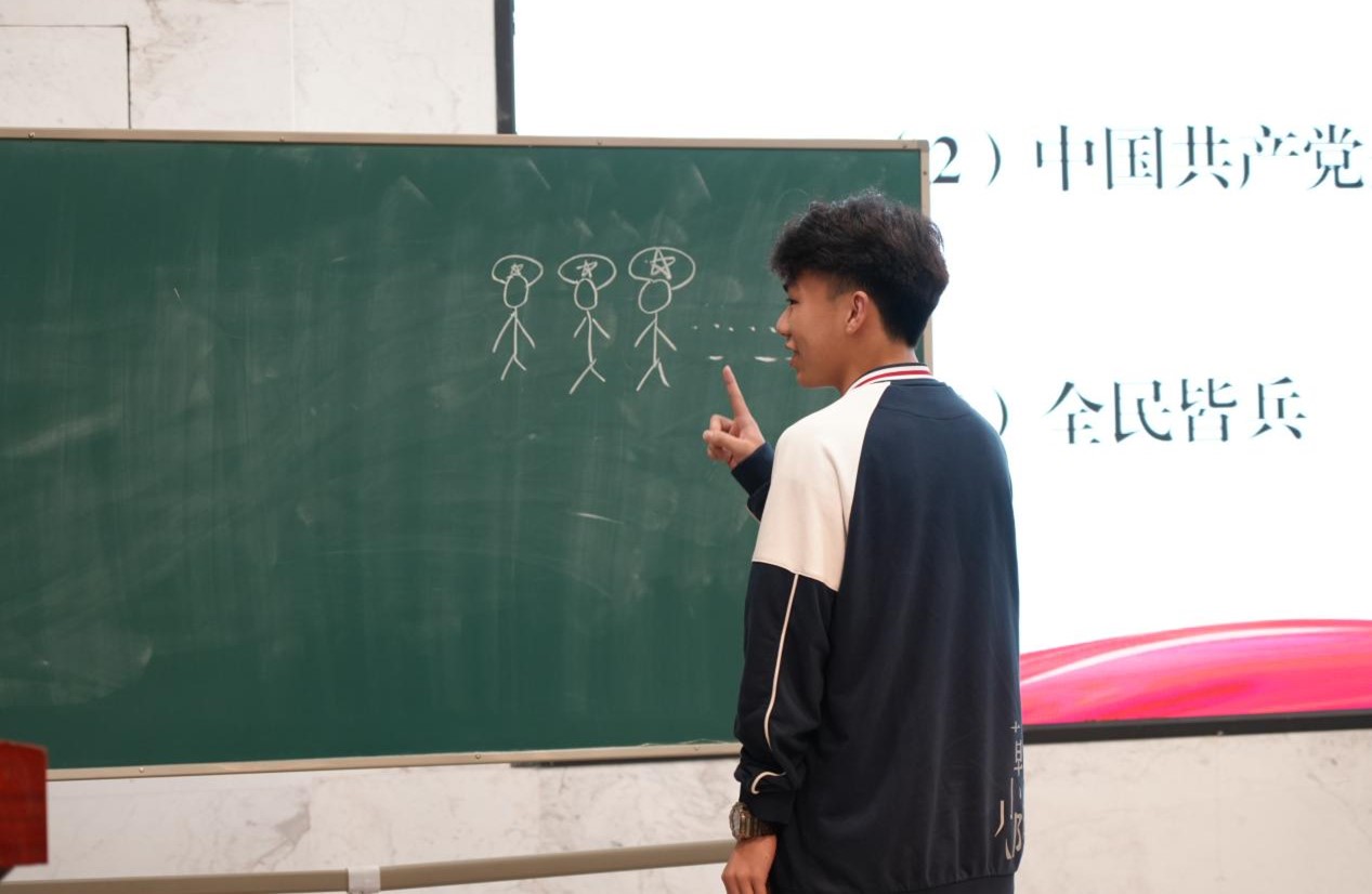 研读团成员胡嘉鑫以《抗日战争的胜利——个人命运与国家存亡紧密相连》为题展开理论宣讲。从“历史烟云”的宏观叙事到“命运交响”的个体抉择,他运用无数中华儿女将个人命运与国家存亡紧密相连的英勇事迹,带领师生回望波澜壮阔的抗战岁月。