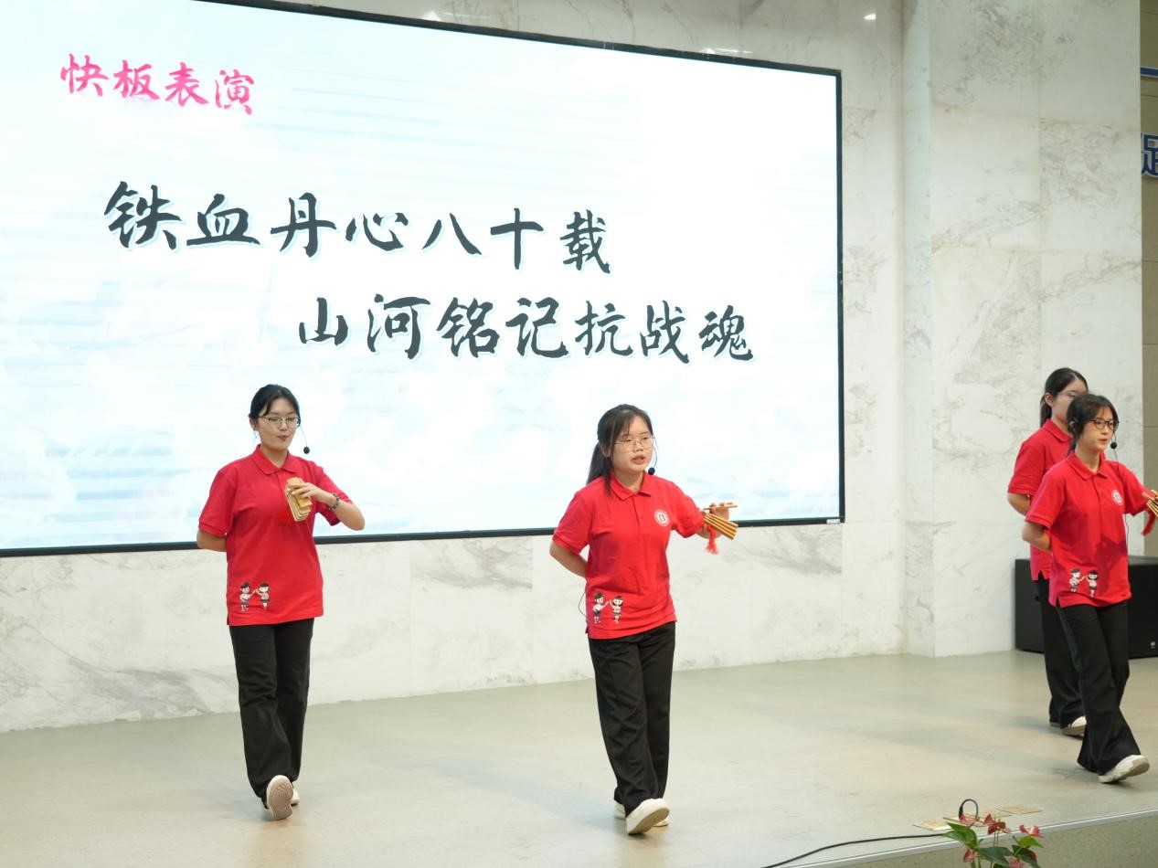 员工宣讲团成员以快板《铁血丹心八十载,山河铭记抗战魂》创新演绎抗战故事,将抗战历程转化为朗朗上口的韵文,配合生动的肢体语言,重现中华民族共赴国难的壮阔图景,点燃现场师生的爱国热情。