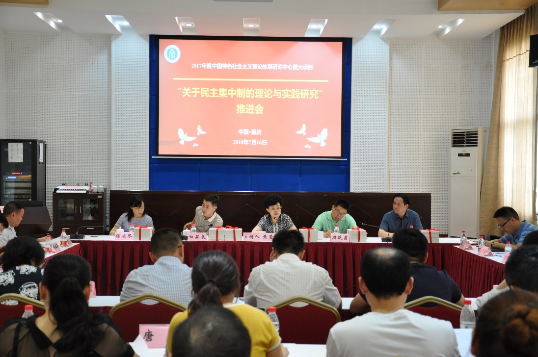 重庆市中国特色社会主义理论体系研究中心秘书长、重庆市委宣传部理论处处长周廷勇作了重要讲话。周廷勇处长对课题组前期研究取得的成果给予了充分肯定,认为:课题研究总体呈现良好的推进态势,阶段性成果丰硕、成绩喜人。他要求,下一阶段课题组应紧紧围绕党的十九大精神、习近平新时代中国特色社会主义思想和改革开放四十周年等,有计划、高效率的推进课题研究。为此,他对课题组提出了三点希望:一是在理论上站位更高。主动将对习近平新时代中国特色社会主义思想的研究与民主集中制理论与实践的研究有机结合,特别是要站在全面从严治党和加强党的政治建设的战略高度来推进课题各项研究工作。二是在思路上更优化,应对不同类型党组织实施民主集中制的现状进行全面调研,针对调研中发现的问题提出操作性强的对策,以咨询报告的形式呈送重庆市委或更高层次的领导,提升课题研究的咨政服务能力。三是在成果上更丰硕,应力争在《人民日报》、《求是》、《经济日报》和《光明日报》等权威报刊和CSSCI来源期刊上发表更多研究成果,提高课题研究的学术影响力。