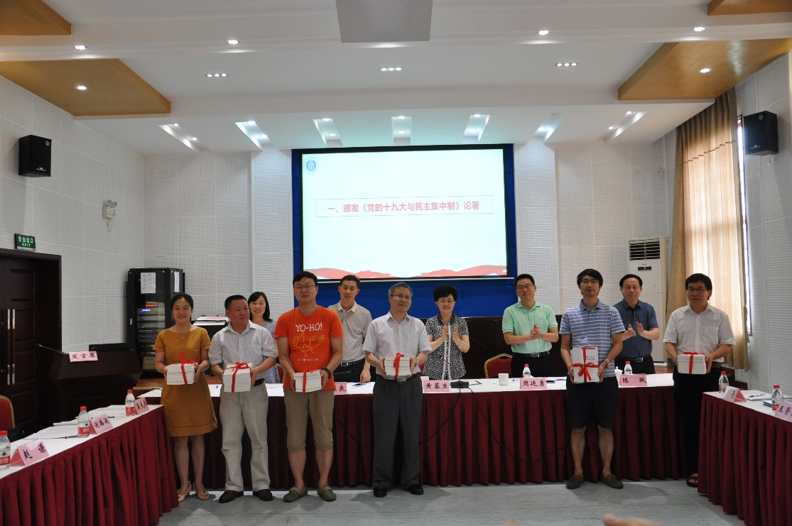 课题组首席专家黄蓉生教授介绍了课题前一阶段研究的进展情况和此次推进会的主要任务,并向向各子课题代表颁发了《党的十九大与民主集中制》论文集(样书)。