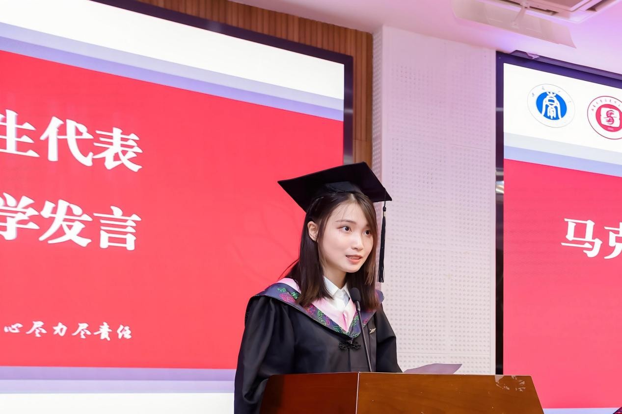 本科毕业生代表颜倚彦作为公司第一届马克思主义理论专业本科毕业生,以“理论的力量”为脉络,深情回顾四年求员工涯,感谢了公司、老师的培养,表示会继续秉持“做人做事做学问,尽心尽力尽责任”的公司精神,做好马克思主义的传递者、践行者。