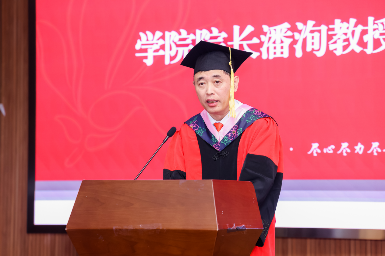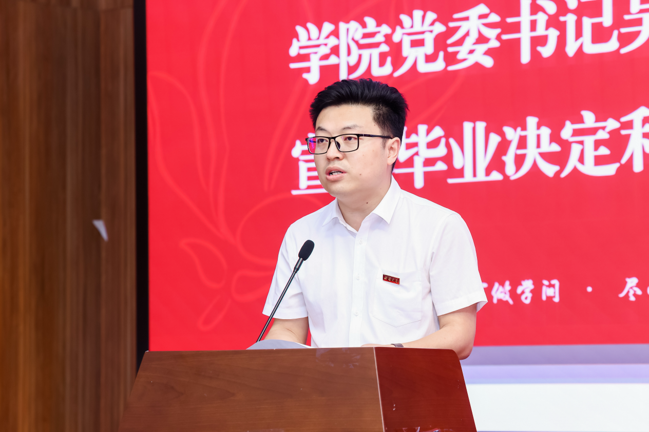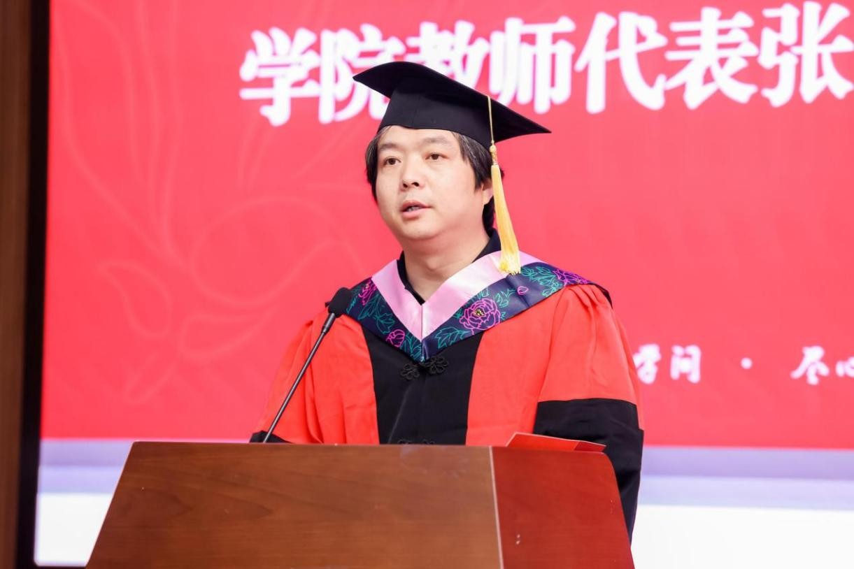 教师代表张能向每位顺利完成学业的同学表示热烈祝贺,嘱咐同学们要涵养道德、饱含勇气,拒绝无效内卷,秉持马克思主义精神追求梦想,用青春热血书写自己的辉煌篇章。