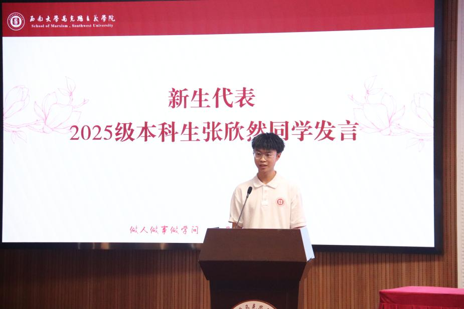 2025级本科生新生代表张欣然发言,讲述对于“含弘光大,追寻真理之光”的深刻理解,并表示要肩负“继往开来”的使命,书写赤诚理想。