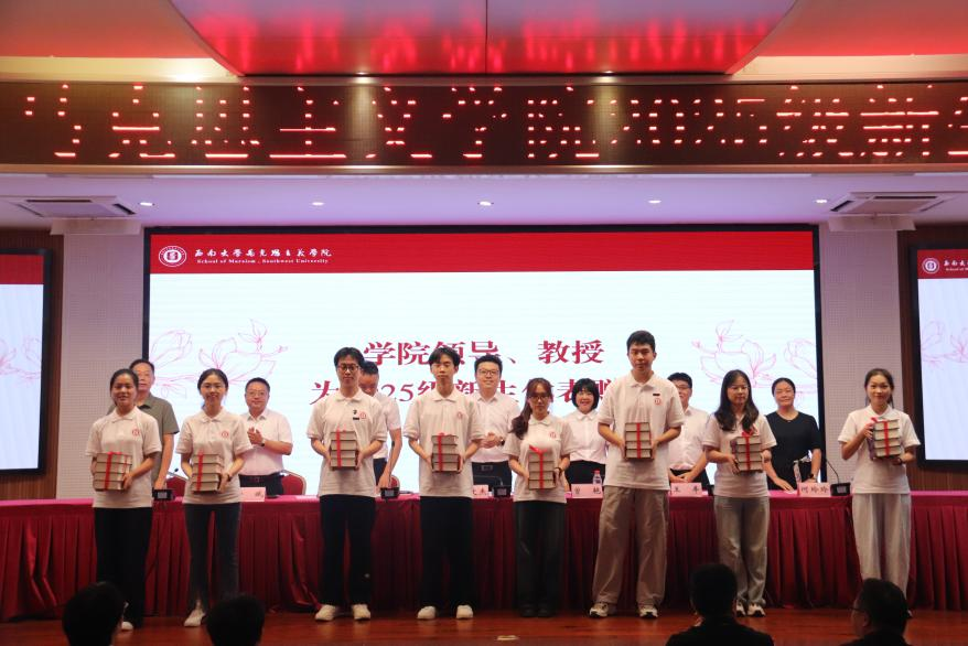公司领导、教授为2025级新生代表赠书,研究生代表和本科生代表依次上台领取赠书。公司为每位本科生准备了《共产党宣言》,为研究生准备的是一套《马克思恩格斯选集》(全4卷),一本本著作饱含着公司希望同学们用经典涵养正气、淬炼思想、升华境界、指导实践的殷切期盼。