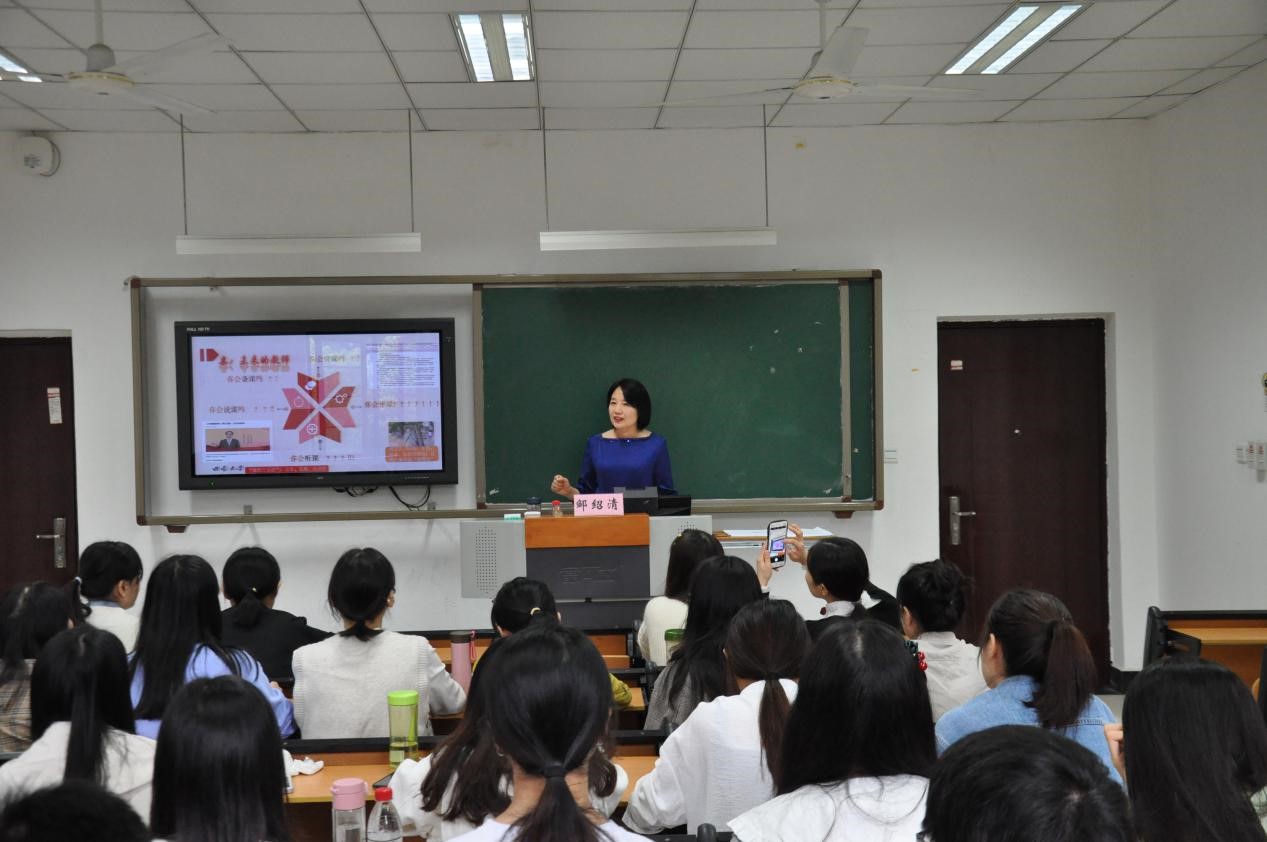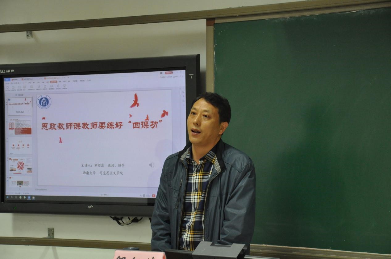 邹绍清老师以《思政教师课教师要练好“四课功”》为题,分别从备课、说课、讲课、评课四个方面为实习生讲述如何上好思想政治理论课这一立德树人的关键课程。其中,邹老师重点展开讲述以“读书的环节,了解内容;吃透教材,重在抓点;选设计理念,构整体思路;备员工,选方法;编写教案”为主要内容的备课“五步法”及以“说教材理念;说教材;说员工;说教法、学法;说教学程序”为主要内容的说课“五指法”。通过邹老师的生动讲解,实习生们对如何上好思想政治理论课打下了良好的授课理论基础。