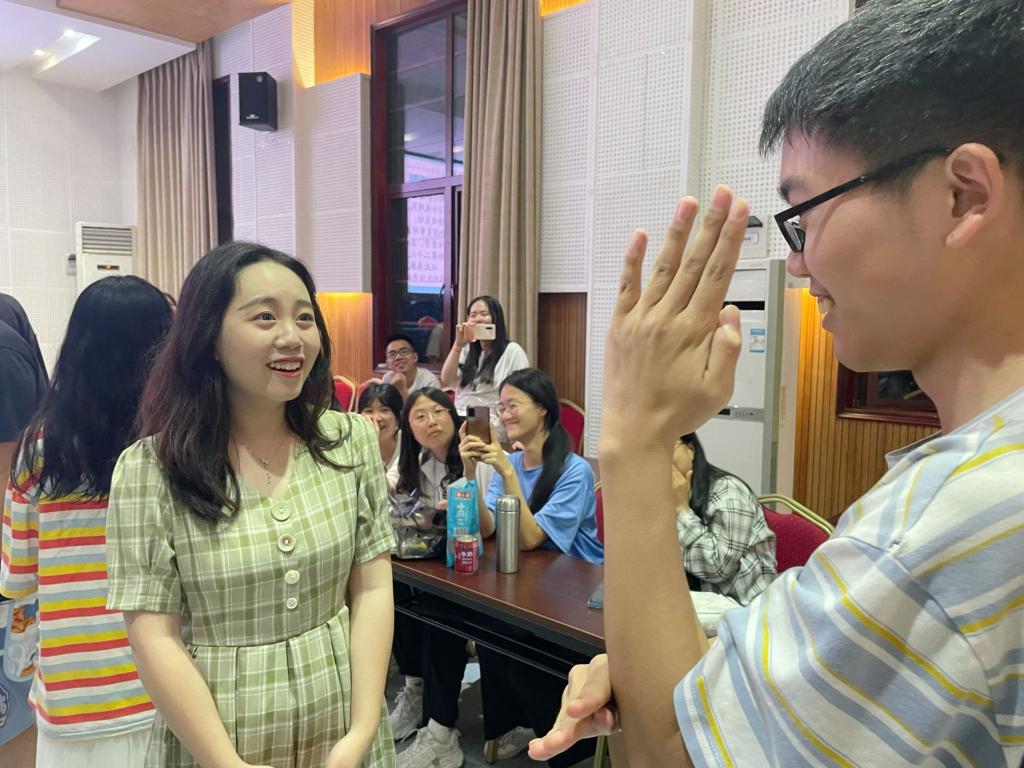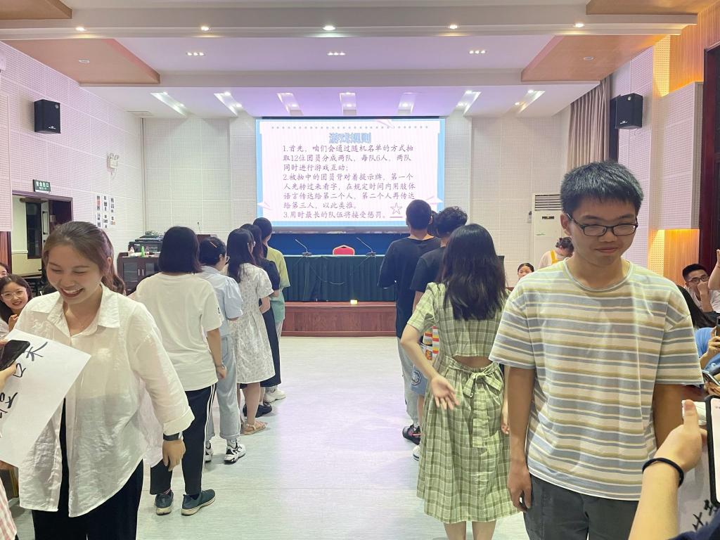 随着“驿站传书”游戏的开展,欢声笑语也渐渐溢满了501报告厅。被随机抽中的团员们一起接受了默契大考验,他们用丰富传神的肢体动作接力向彼此描绘关键词,默契十足!