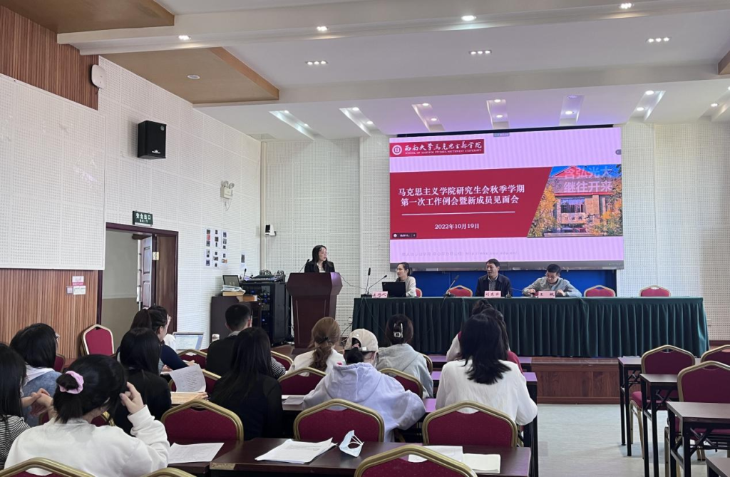其次,研会执行主席鲍雪倩就分管部门及工作进行汇报。她详细捋顺了研会的总体架构及各部门的工作职能,明确了各部门工作流程。她强调研会是一个和谐融洽的大家庭,虽然各部门各司其职,但都是研会重要组成部分,希望新成员尽快融入、以实际行动高质量完成各项工作任务,保障研会工作切实有效地开展。