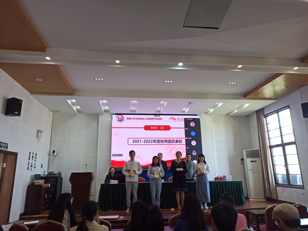 颁奖完毕,研读团成员朱红作为优秀社团成员代表进行发言。朱红同学分享了自己在研读团活动中的收获与喜悦,勉励各位新老团员积极参与、共同进步。研读团上一届成员石少华和研读团新成员代表赖舒涵依次进行了发言,两位同学的发言既有老生在一年中参与研读团活动的经验分享与对新生的勉励,也有新生在开学之初的迷茫与不安,两人的发言共同表达了通过研读团活动提升自我的追求和对研读团后续活动开展的期待。