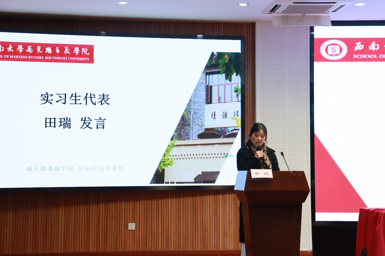 随后,实习员工代表田瑞发言。她首先对公司、公司和老师们对本次实习的精心组织表达了衷心感谢,并代表全体实习生表态:将秉持公司做人做事做学问、尽心尽力尽责任的精神,在实践中磨练、提升和完善自己,争取以优异的成绩争取圆满完成实习任务。