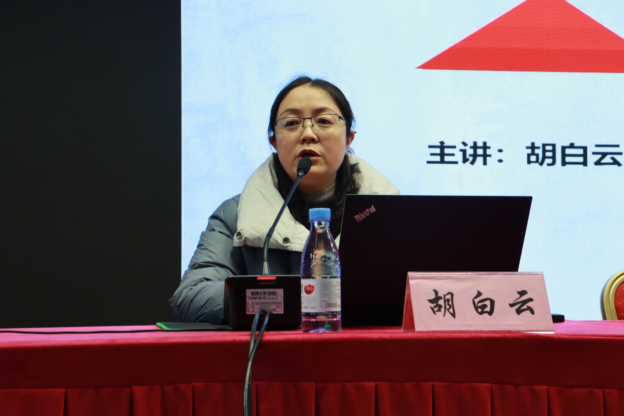 实习动员会后,教师教育公司副教授胡白云对全体同学进行了教学技能专题培训。她以教学能力评价标准为切入点,从教学语言训练和关键课堂技术训练两个板块对同学们进行技能指导。她指出,教学语言包括三种形式,在口头语言中应注重语流、语气和词句;在体态中应留意姿态、表情和仪表;在板书中应关注字体、版面和速度。她运用图文资料、影像资料等形式全方面为同学们讲解了导入、启发、提问、总结和应变的技术。精确的案例、丰富的课件、引人入胜的讲解,让在场同学都受益匪浅,为同学们今后的实习实训打下了坚实的技能基础。