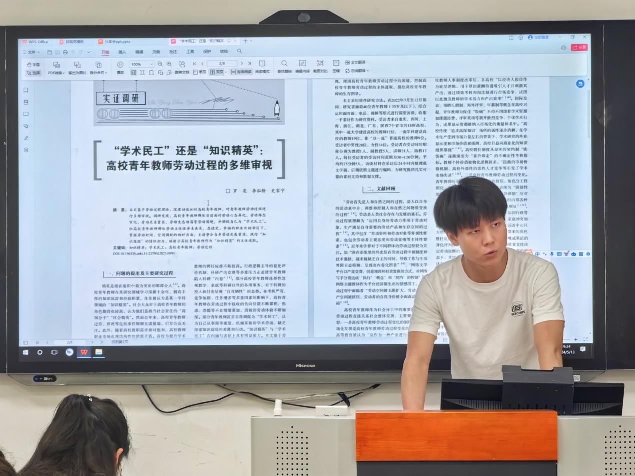 活动的第二个环节,李泓桥同学就调查性论文、时政性论文、理论性论文的写作心得进行了分享,主要有两点经验。首先,他以《“学术民工”还是“知识精英”:高校青年教师劳动过程的多维审视》这篇文献为例,分析写论文前应该如何破题,如何构思整个论文的框架逻辑。指出在进行大框架构建时,应一级一级厘清标题,逻辑分析不能只停留在三级目。其次,对于时政性论文,在研究生这个阶段可以更多关注对学界以往观点进行梳理和细分。此外,李泓桥同学还用幽默生动的方式分享了如何选择投递的论坛和期刊、如何保持良好的学习心态和生活节奏等话题。