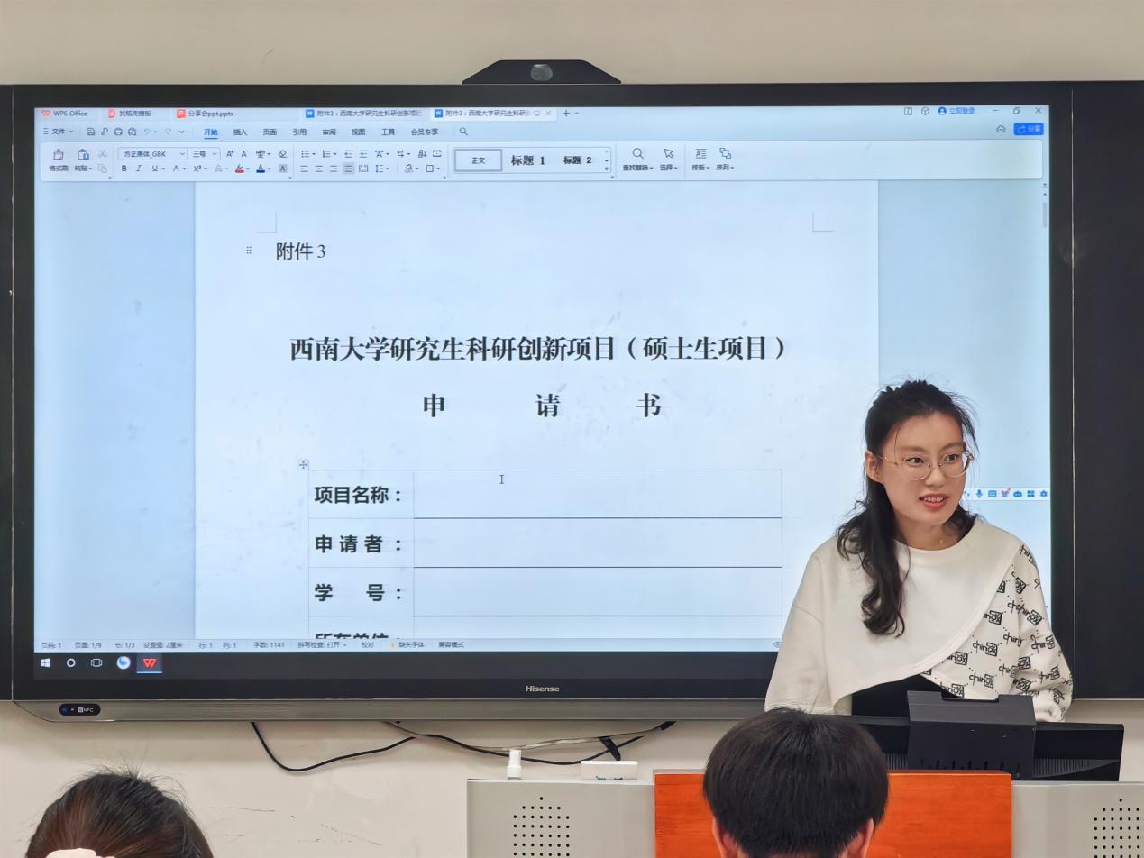 活动的第一个环节,以项目申报经验分享为主题。史家宁同学结合自身实践经验,针对伟德BV1946官网研究生科研创新项目应如何撰写申请书做出分享。她主要从项目选题、立项依据、以及研究方案三个方面展开。首先,在如何选题这个问题上,她建议可以从与老师研究方向一致、当下热点以及自己的兴趣点这三个方面考虑。其次,立项依据这一部分应囊括项目的研究目的、意义;国内外研究现状分析和发展趋势;项目应用前景和学术价值;现有研究基础条件、手段及指导教师情况等。再者,研究方案应涵盖研究目标、研究内容、研究思路和拟解决的关键问题;拟采取的研究方法及可行性分析;本项目的创新之处以及预期的研究进展。史家宁同学对每一个板块都进行了详细的阐释和举例说明,并指出各个学科专业应根据自己的学科特点进行适当调整。