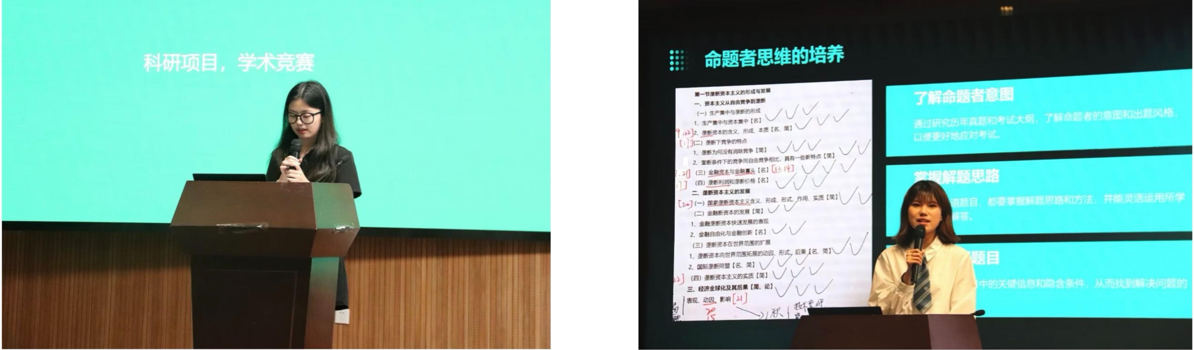 座谈交流环节。三位分享人就同学们提出的为什么要升学、如何稳定心态、如何获得考研学习资料等问题提出了具有针对性的对策。他们认为要保持对马克思主义理论、对思想政治教育的热爱与追求,充分运用学习资源,持续扩展自身知识体系,保持自信,坚定自己选择的道路,才能拥有不断向上钻研的内生动力。