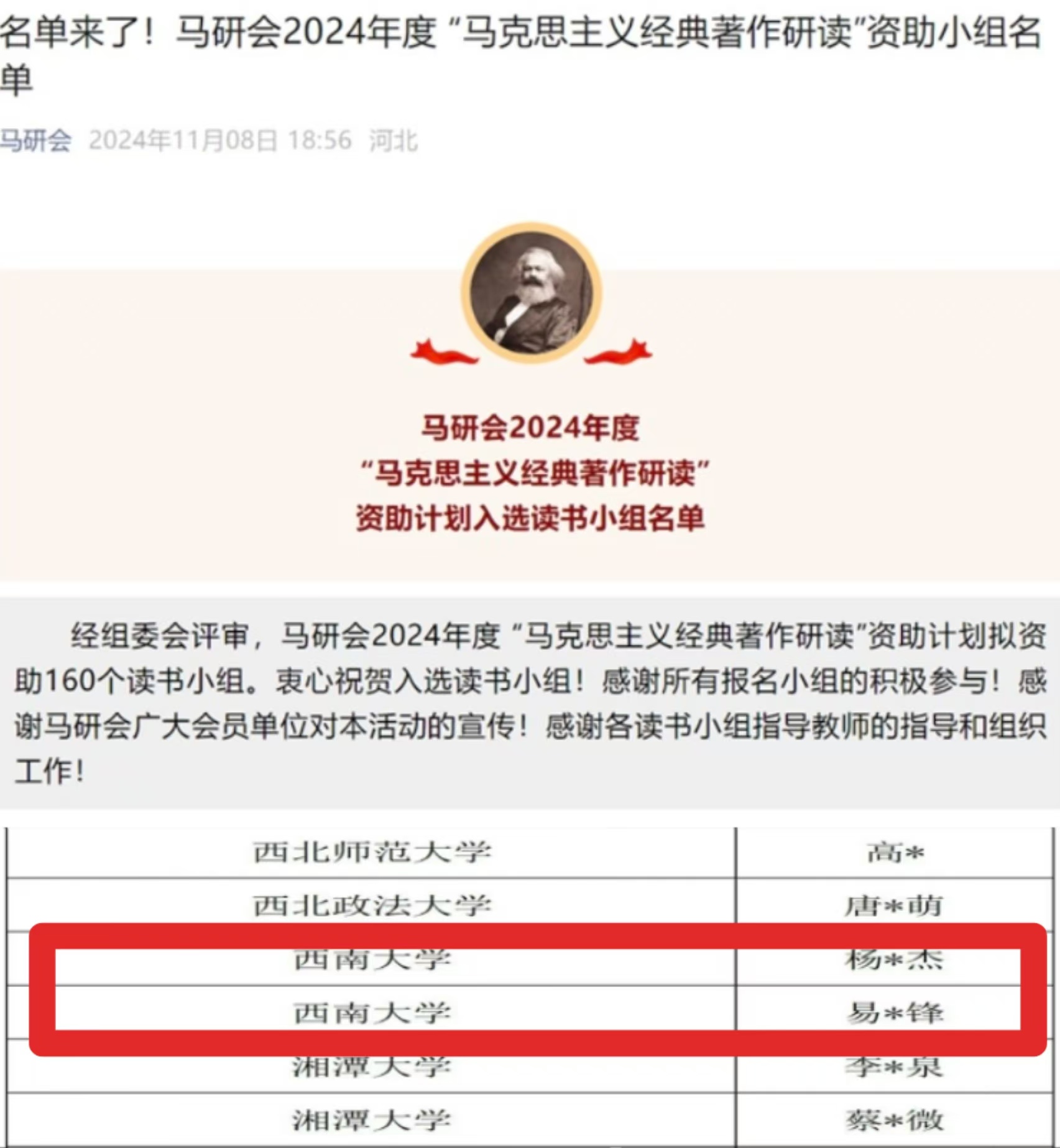 近日,中国高等教育学会马克思主义研究分会2024年度“马克思主义经典著作研读”资助计划名单正式公布,来自全国各高校共计160个读书小组入选。公司组织申报的“绩镛言马”读书小组和“回到列宁”读书小组成功入选。