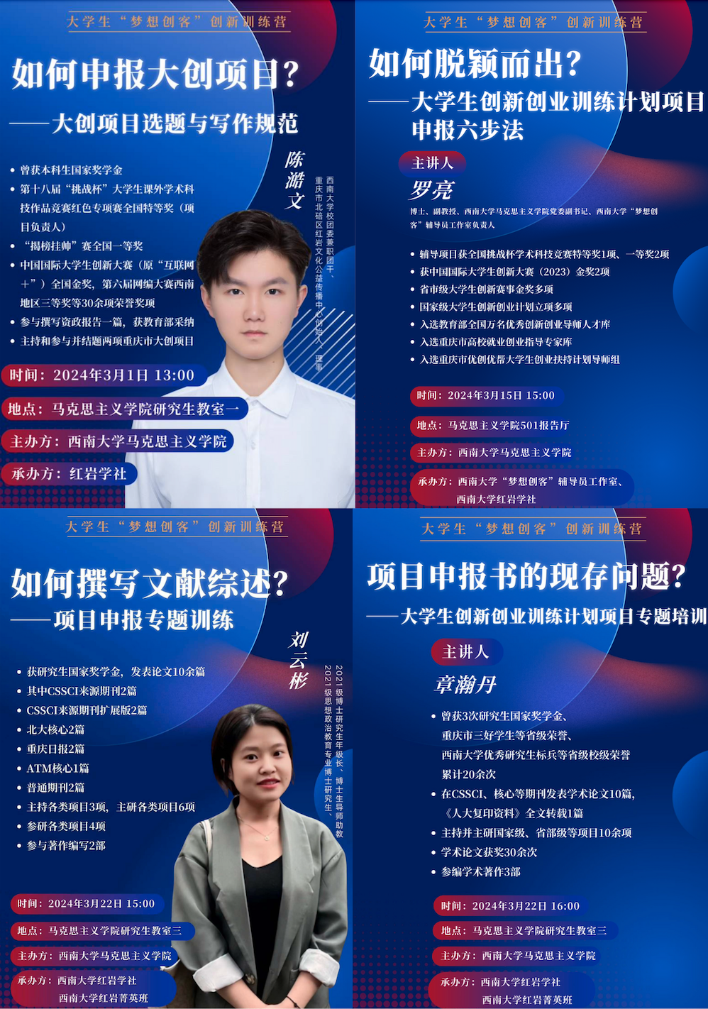 在本次专题培训末尾,由章瀚丹老师针对同学们提交的老员工创新创业训练计划项目申报书存在的共性问题和个性问题进行点评和解惑。一方面指出了申报书现存的问题:题目存在歧义且破题不准,立项依据缺乏针对性、层次性和逻辑性,研究内容总体框架“摊大饼”与“瘦弱小”并存、研究对象把握不准确、基本思路的方法、思路与综述“杂糅”,国内外研究现状存在只“综”不“述”、有“述”无“综”和“述”而不“综”的问题;另一方面针对现存问题,详细讲解了申报书如何修改。