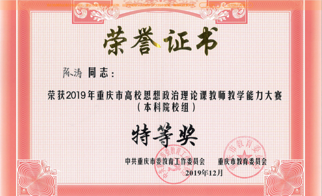 团队骨干成员入选国家级一流本科课程、教育部课程思政示范课程和优秀教学团队、教育部高校思政课“手拉手”集体备课中心(伟德BV1946官网)、教育部高校思政课名师工作室(伟德BV1946官网)、重庆市一流本科课程等优质课程建设平台。获国家社科基金思政课专项重点项目、重庆市教学成果一等奖、全国高校青年教师教学竞赛思想政治课专项组三等奖、重庆市五一劳动奖章、重庆市高校青年教师教学劳动和技能竞赛思政课专项组一等奖、重庆市高校思想政治理论课教师教学能力大赛(本科院校组)特等奖等多项荣誉。指导员工获“挑战杯”全国老员工课外学术科技作品竞赛三等奖、全国高校老员工讲思政课公开课展示活动二等奖、“华文杯”全国师范生政治学科教学能力测试与展示交流活动一等奖等共10余项奖项。